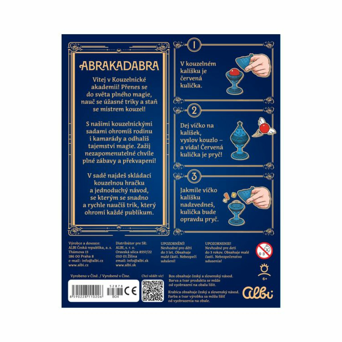ABRAKADABRA – Kulička a kalíšek: Kouzlo, které se vždy vrátíJednoduché, ale přesto úchvatné kouzlo s červenou kuličkou, která se ztrácí a znovu objevuje v kalíšku jako by poslouchala kouzelníkova slova. Sada Kulička a kalíšek nabízí skvělý vstup do světa magie pro každé dítě, které chce začít kouzlit a ohromit své publikum.Jak to funguje?Kouzelnický kalíšek ukrývá tajemství, díky kterému se kulička může ztratit, objevit i přemístit bez povšimnutí. Děti se naučí trik během chvilky díky přehlednému tištěnému návodu a videonávodu s Jiřím Hadašem, který vše názorně předvede.Co rozvíjí