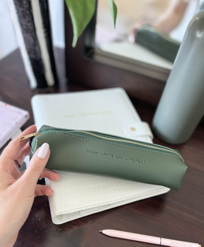 Designový penál tmavě zelený – Think. write. draw. repeat.