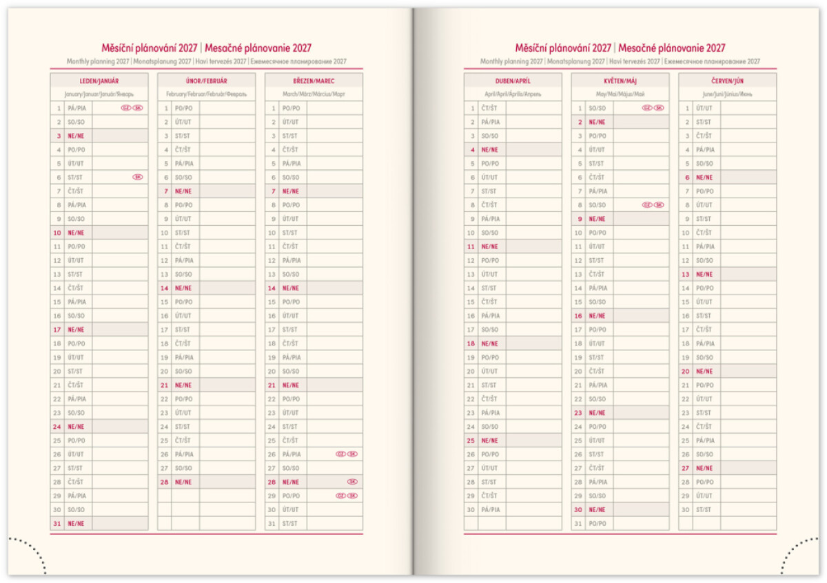 doplňky: plánovače, svátky, jmenný seznam, mapy, záložka, perforované růžky