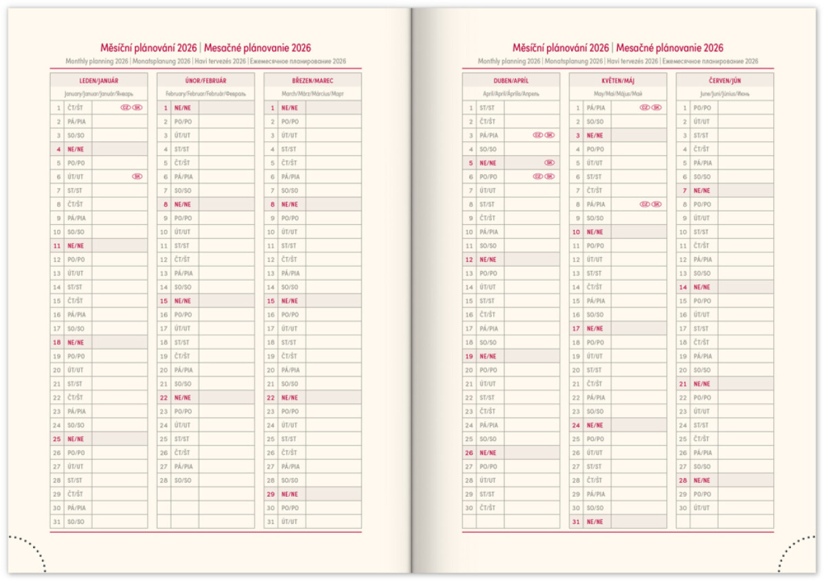 doplňky: měsíční a roční plánovače, svátky, seznam jmen, mapy, textilní záložka, perforované růžky
