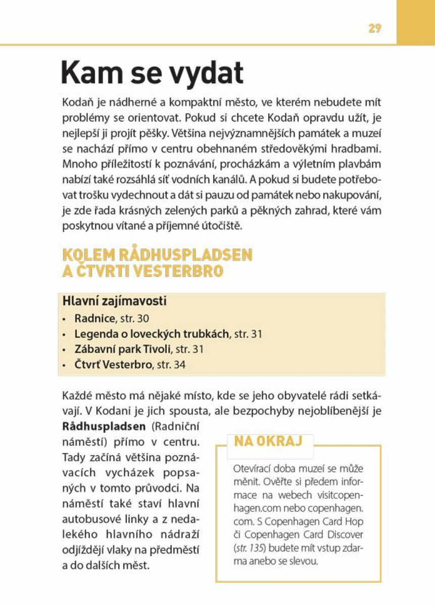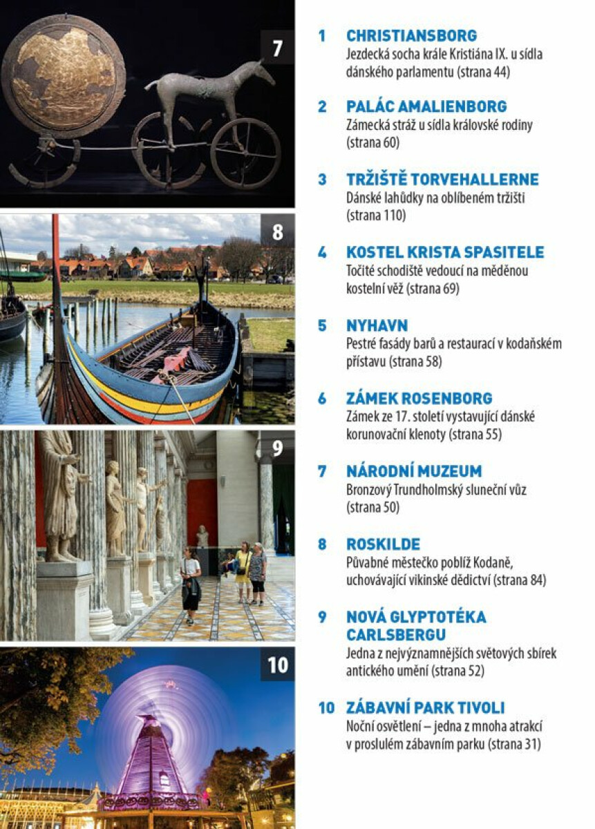 Nechte se inspirovat bezpočtem krásných míst, která přímo vybízejí k návštěvě. V úvodu knihy najdete tři itineráře: první nabízí plán na ideální den ve městě a druhý vás provede po nejlepších královských památkách. Třetí itinerář následuje okružní linku metra Cityringen, a skýtá tak možnost poznání města z trochu jiné perspektivy.