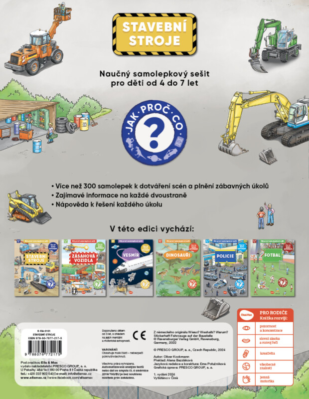 Jak? Proč? Co? V tomhle naučném samolepkovém sešitě pro děti od 4 do 7 let najdete odpovědi snad na všechny zvídavé otázky týkající se stavění a stavebních strojů. Na každé dvoustraně se dočtete spoustu zajímavostí, a navíc máte k dispozici přes 300 samolepek k dotváření scén a plnění zábavných úkolů! Ty zapeklitější vám dají možná trošku zabrat, ale žádný strach – na konci knížky nechybí malá nápověda…