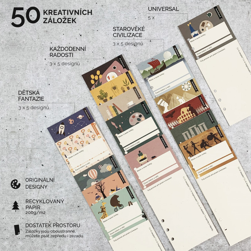 50 oboustranných záložek s autorskými ilustracemi