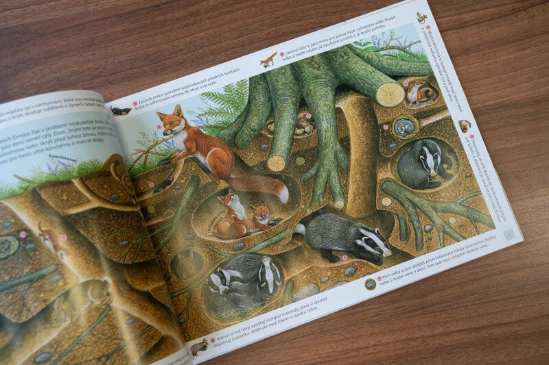 Tato kniha děti formou přehledných vyobrazení doprovodí nejrůznějšími oblastmi prostředí živých tvorů, na která se jinak nedostanou – tyto domečky se totiž nacházejí pod zemí. Živočichy se to tu jen hemží a kniha je výbornou ukázkou toho, jak je život na Zemi vzájemně propojený a jak se mu daří na více místech, než by se zdálo. Malí čtenáři ve věku 7-11 let zde uvidí, co se děje pod jejich nohama a jak neuvěřitelně rozmanitý je život na naší planetě. Poznají ty nejúžasnější podzemní biotopy světa, od vyhřátých arktických brlohů až po písečné nory v pouštích, i nejrůznější společenství druhů, jimž je domovem či úkrytem půda planety Země, ať už je bohatá na živiny nebo zmrzlá na kámen. Zjistí, jaké jsou ohromující možnosti přizpůsobení organismů na své prostředí, jejich vzájemné ovlivňování mezi sebou i to, jak působí na své okolí. Kniha nabízí poznání milovníkům přírody i z řad těch, kdo se čtení spíše vyhýbají. Každé z podrobně vyvedených panoramat je vyobrazením jeviště rušného života pod zemí. Živočichové v hlavních rolích jsou pak přehledně uvedeni na okrajích stránek. Ilustrace také obsahují propracované detaily umožňující snadné pozorování jednotlivých stanovišť. Tohoto ideálního průvodce světem života pod zemí rozhodně stojí za to mít v knihovničce.